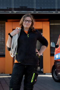 Von wegen “Männerberuf”. Elektrotechnikerin Jaqueline sorgt für “grüne” Energie in Neubauten.